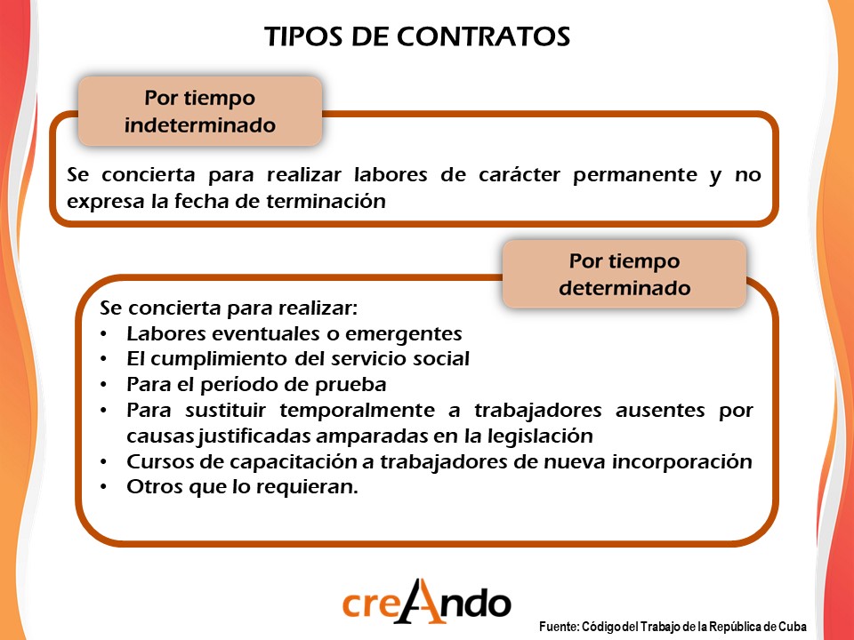 El contrato de trabajo se concierta por escrito con ejemplares para el empleador y el trabajador. En las entidades, excepcionalmente, para actividades emergentes o eventuales, de cosechas o servicios a la población y en otros casos que la legislación autorice, el contrato de trabajo puede ser verbal para un período que no exceda de noventa días.