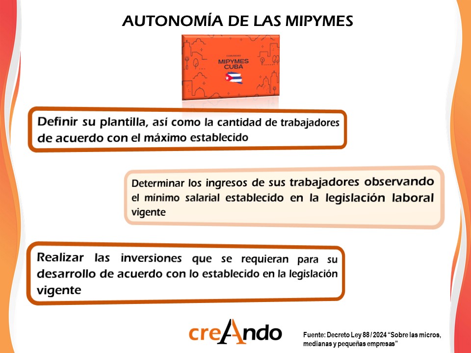 Para el ejercicio del trabajo por cuenta propia se requiere la aprobación de un proyecto de trabajo, que a los efectos de la aplicación de este Decreto-Ley contiene la descripción de la o las actividades a realizar, el lugar donde se ejerce, la cantidad de trabajadores a contratar y el horario de funcionamiento. El trabajo por cuenta propia se puede ejercer de forma autónoma o emplear hasta un límite de tres personas que contrata como trabajadores, las que pueden ser familiares o no.